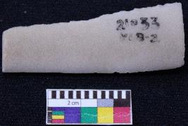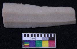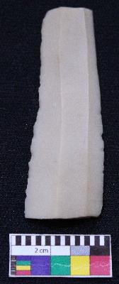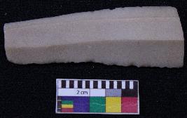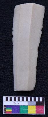 | Description / विवरण | Fragment of blade is off white in color, having both ends broken, retouched sides, ridges on the top and triangular section. |