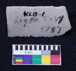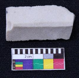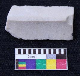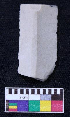 | Description / विवरण | Fragment of blade is white in color, made of fine grained stone, having smooth body, both ends broken, retouched sides, mid ridge on the top and triangular section. |