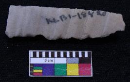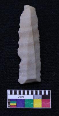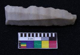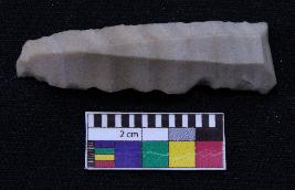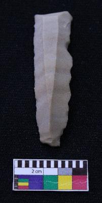 | Description / विवरण | Fragment of blade is dull brown in color, having one end broken, other end is curved, retouched sides and ridges on the top. |
