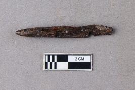 | Description / विवरण | A broken tip of a bone point which shows working and is slightly damaged along with cut marks. |