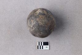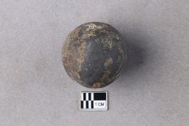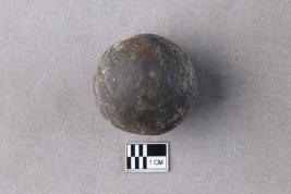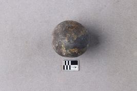 | Description / विवरण | A larger, slightly heavy sphere of terracotta. It is black in colour. Patches of soil are visible on the surface of the sling ball. |
