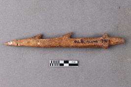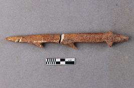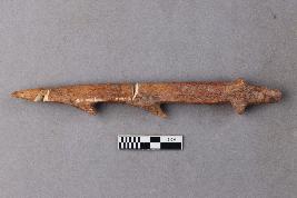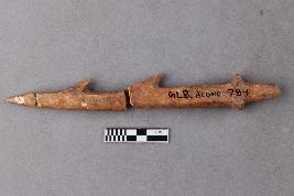| Description / विवरण | A small, cylindrical, elongated shaft of bone with a pointed tip, two projecting barbs, and a short tang at the end. This is a bone harpoon which shows breakage at several points. |