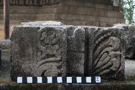 | Description / विवरण | This is an architectural fragment. There are floral designs present on the surface which is flanked by a protruding edge. On the right side, there is a duck that is covered by creepers. On the left side floral motives are present. |