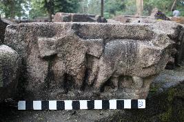 | Description / विवरण | This is a part of architectural design where there are two elephants are present. The elephant on the right side is facing the front direction and its face is broken. The elephant on the left side is facing the left side. The face is broken. There is a design that can be seen over the abdomen area. |