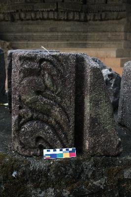 | Description / विवरण | This is a part of the architectural element. Creepers are present on the surface. There is a shallow vertical carving present in the middle. The left portion is broken. |