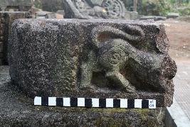 | Description / विवरण | This is a large rectangular piece of an architectural fragment. There is a figure of a lion carved out on the lateral surface. The tail of the lion is in the upward position. Hind legs are spread out whereas the chest of the lion is leaning on the pedestal. From the neck other portion of the lion is missing. |