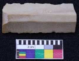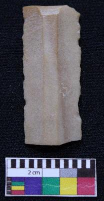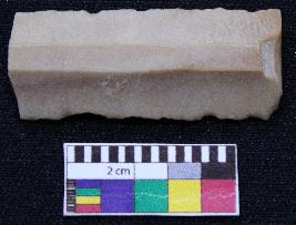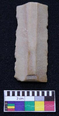 | Description / विवरण | Fragment of blade is dull brown in color, having broken ends, retouched sides, ridges on the top and triangular section. |