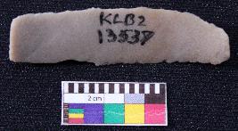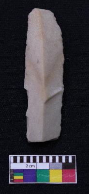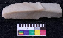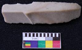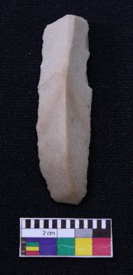 | Description / विवरण | Fragment of blade is dull brown in color, having one end broken, retouched sides, mid ridge on the top and triangular section. |