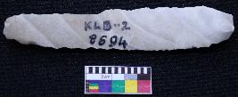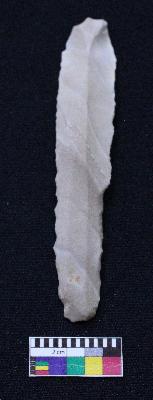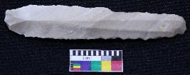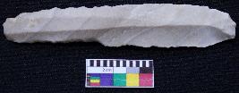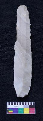| Description / विवरण | Intact blade is off white in color, having positive bulb of percussion at one end, other is curved, retouched sides, mid ridge on the top and triangular section. |