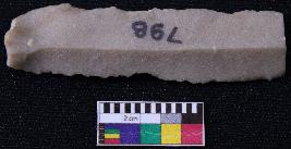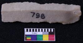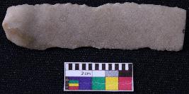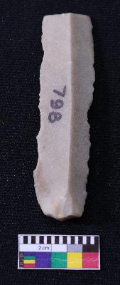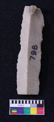 | Description / विवरण | Fragment of blade is dull brown in color, having positive bulb of percussion at one end, other end is broken, retouched sides, mid ridge on the top and triangular section. |