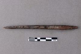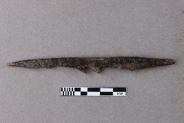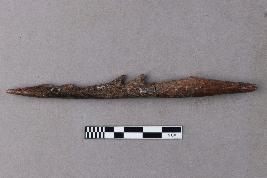 | Description / विवरण | A small, cylindrical, elongated shaft of bone with a pointed tip, four projecting barbs, two of which are broken off and a narrow tang at the end. This is a bone harpoon which shows breakage and mending. It is a dark shade of brown. |