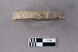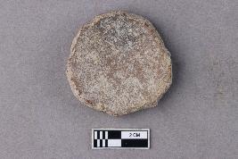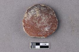 | Description / विवरण | An unevenly circular disc of terracotta with red slip on one surface. |