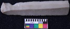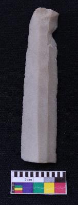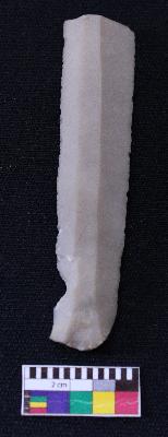 | Description / विवरण | Fragment of blade is off white in color, having positive bulb of percussion at one end, other end is broken, retouched sides, ridges on the top and triangular section |
