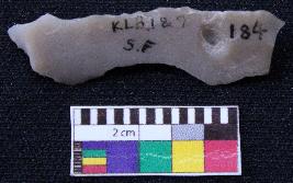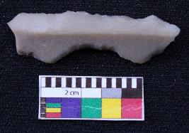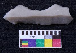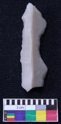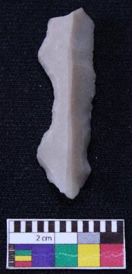 | Description / विवरण | Fragment of blade is off white in color, having both ends broken, retouched sides, mid ridge on the top and triangular section. |