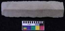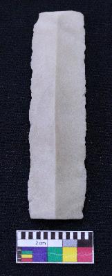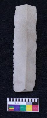 | Description / विवरण | Fragment of blade is off white in color, having both ends broken, retouched sides, mid ridge on the top and triangular section. |