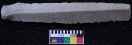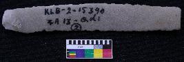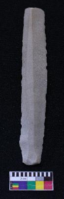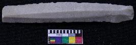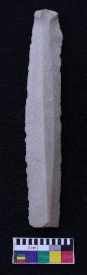 | Description / विवरण | Fragment of blade is off white in color, having positive bulb of percussion at one end, other end is broken, retouched sides, mid ridge on the top and triangular section. |