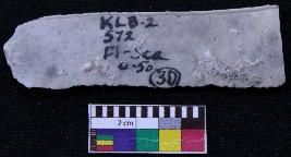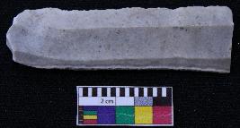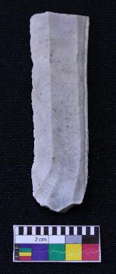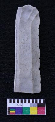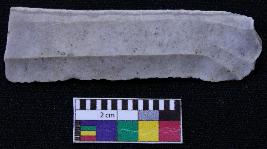 | Description / विवरण | Fragment of blade is off white in color, having positive bulb of percussion at one end, other end is broken, one side is retouched, other side has no retouching, ridges on the top and thin section. |