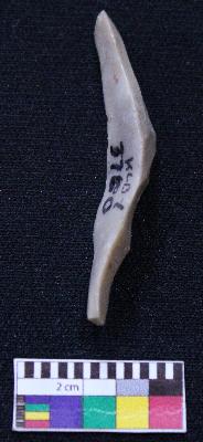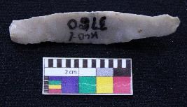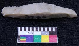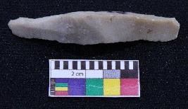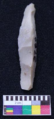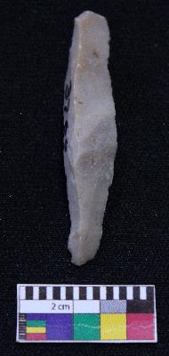 | Description / विवरण | Complete blade made of fine-grained stone, having smooth body, positive bulb of percussion at one end, other end is pointed, sides and mid ridge on the top. |