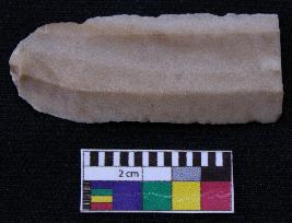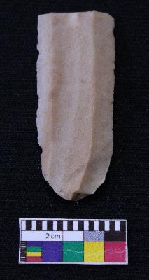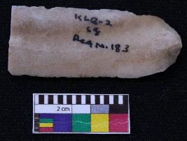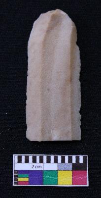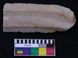| Description / विवरण | Fragment of blade is dull brown in color, having positive bulb of percussion at one end other end is broken, retouched sides, ridge on the top and thin section. |