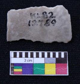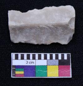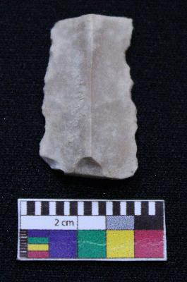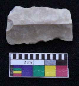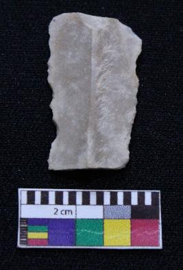 | Description / विवरण | Fragment of blade is whitish in color, having both ends broken, retouched sides, mid ridge on the top and triangular section. |