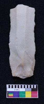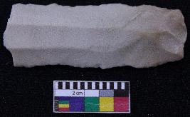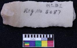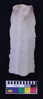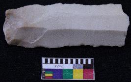 | Description / विवरण | Fragment of blade is whitish in color, having positive bulb of percussion at one end, other end is broken, retouched sides and ridges on the top. |
