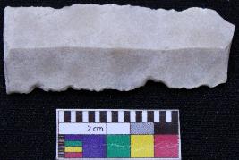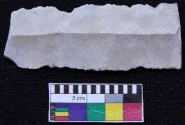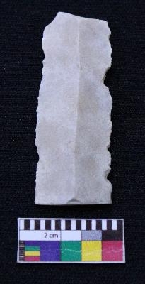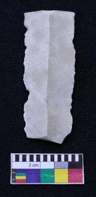 | Description / विवरण | Fragment of blade is white in color, having both ends broken, retouched sides, mid ridge on the top and triangular section. |