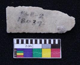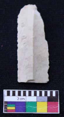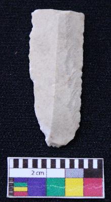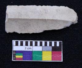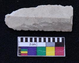 | Description / विवरण | Fragment of blade is off white in color, having one end broken, retouched both sides, mid ridge on the top and triangular section. |