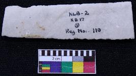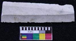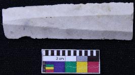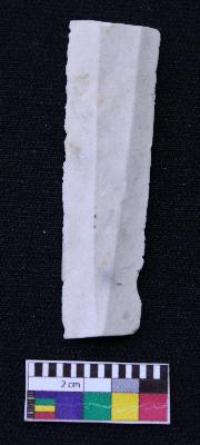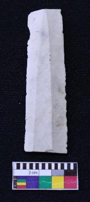 | Description / विवरण | Fragment of blade is white in color, having broken ends, one side retouched, other side have no retouching, mid ridge on the top and triangular section. |