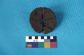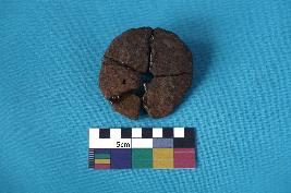 | Description / विवरण | An object in almost circular shape with a hole at the center and a thin cross section of 0.3 cm thickness all over. The hole is at 2cm distance from the edge to the center and the surface is weathered making it rough on either sides. The exterior portion is dul red and the interior one is dark brown in colour. Edges are uneven but smooth. |