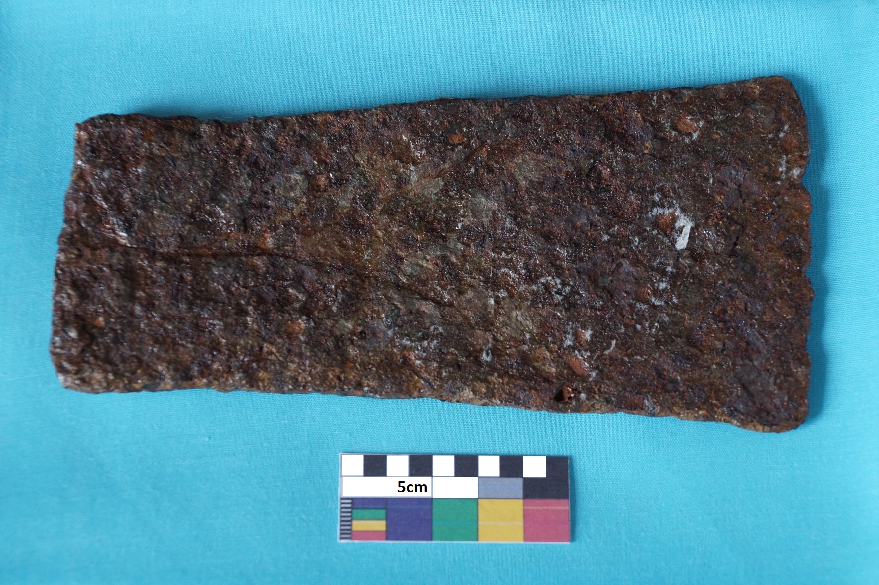 An intact object measuring 17 cm long, 8.5 cm wide at the working/cutting edge and 6.4 cm wide at the other end. The thickness from the posterior end towards the anterior varies i.e 0.4 cm-0.85 cm-0.5 cm respectively, indicating that it is thick in the middle and tapers on either sides. The butt end has been made narrow in its width to facilitate grip for holding the same. The surface is corroded due to which the surface is uneven. The working/cutting edge has been sharpened and minor breakages are evident indicating that it was in use.