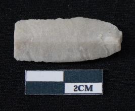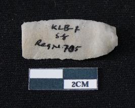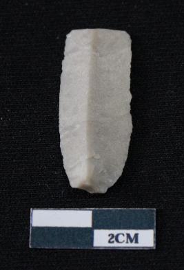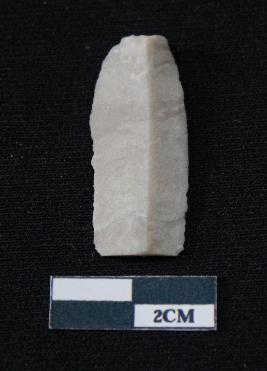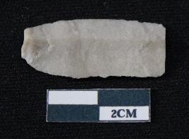 | Description / विवरण | Fragment of blade is off white in color, having positive bulb of percussion at one end, other end is broken, sides are retouched, mid ridge on the top and triangular section. |