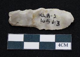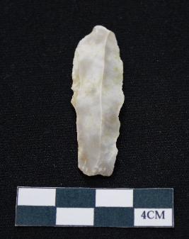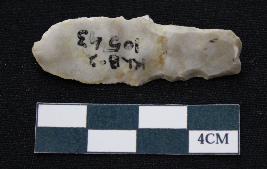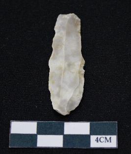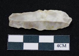| Description / विवरण | Fragment of blade is off white in color, having positive bulb of percussion at one end, other end is broken, sides are retouched, mid ridge on the top and triangular section. |