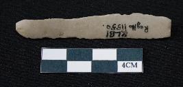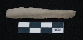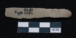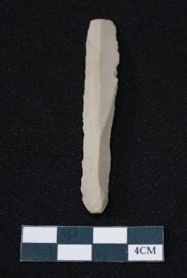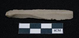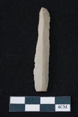 | Description / विवरण | Fragment of blade is off white in color, having long body, positive bulb of percussion at one end, other end is broken, sides are retouched, mid ridge on the top and triangular section. |