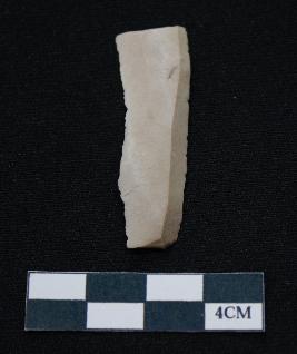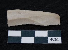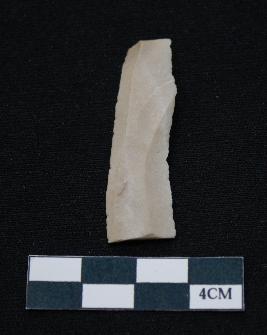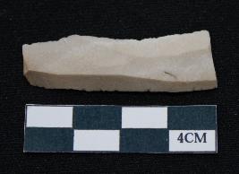 | Description / विवरण | Fragment of blade is off white in color, having long body, both ends broken, sides are retouched, ridges on the top and thin section. |