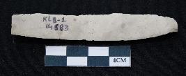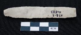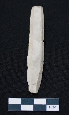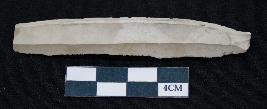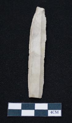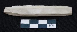 | Description / विवरण | Fragment of blade is off white in color, having long body, positive bulb of percussion at one end, other end is broken, sides are retouched and ridges on the top. |
