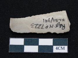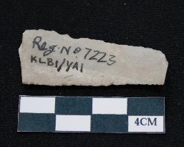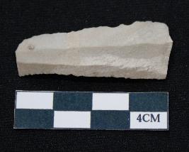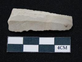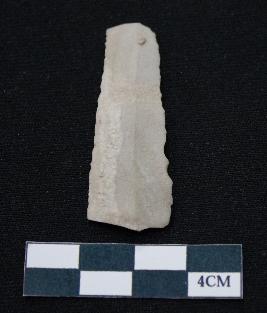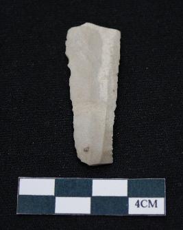 | Description / विवरण | Fragment of blade is off white in color, having one end broken, sides are retouched, ridges on the top and triangular section. |
