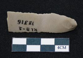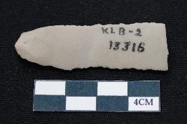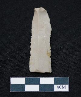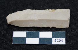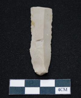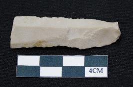 | Description / विवरण | Fragment of blade is off white in color, having smooth body, positive bulb of percussion at one end, other end is broken, sides are retouched, mid ridge on the top and triangular section. |