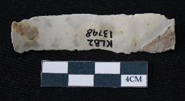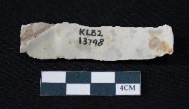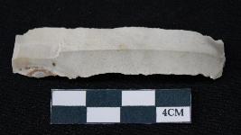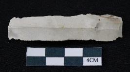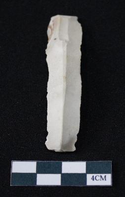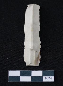 | Description / विवरण | Fragment of blade is whitish color, having smooth long body, one end broken, sides are retouched, mid ridge on the top and triangular section. |