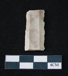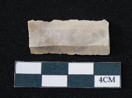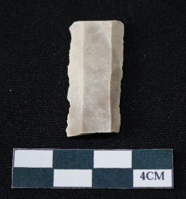 | Description / विवरण | Fragment of blade is off white in color, having smooth body, having both ends broken, retouched parallel sides, ridges on the top and thin section. |