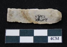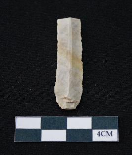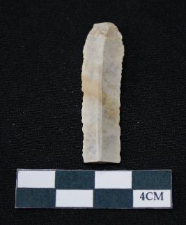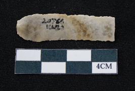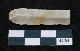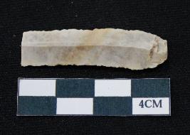 | Description / विवरण | Fragment of blade is off white in color, having smooth body, positive bulb of percussion at one end, other end is broken, retouched parallel sides, mid ridge on the top and triangular section. |