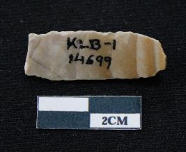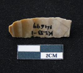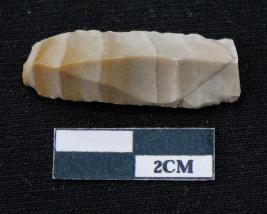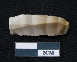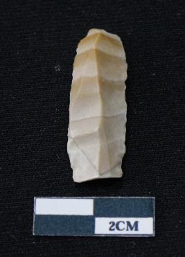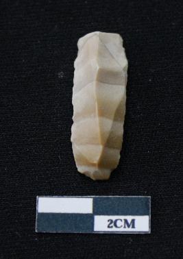 | Description / विवरण | Fragment of blade is partly brown and off white in color, having smooth body, one end broken, sides are retouched, mid ridge on the top and triangular section. |