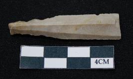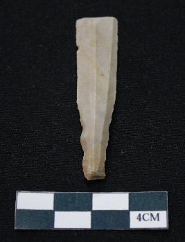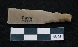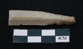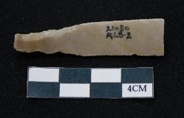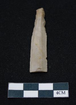 | Description / विवरण | Fragment of blade dull brown in color, having one end broken, sides are partly retouched, ridges on the top and thin section. |