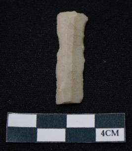 | Description / विवरण | Fragment of blade is dull brown in color, having smooth long broken body, both ends broken, retouched parallel sides, ridges on the top and thin section. |