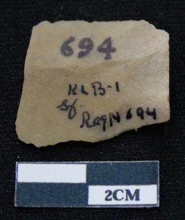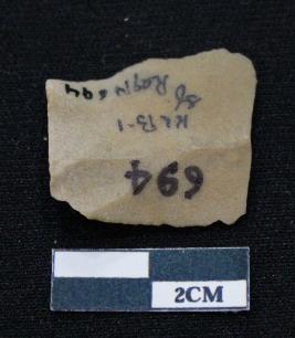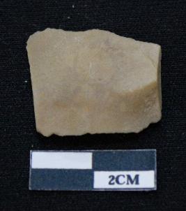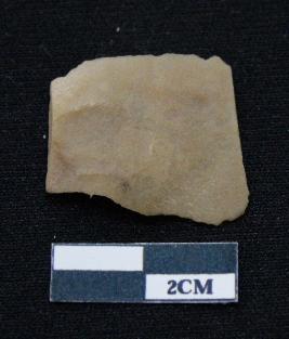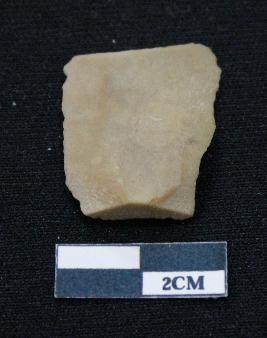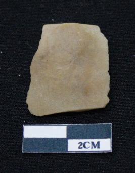 | Description / विवरण | Fragment of blade is dull brown in color, having positive bulb of percussion at one end, other end is broken, body is broken, sides are retouched, mid ridge on the top and triangular section. |