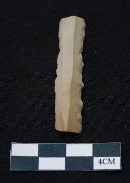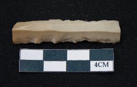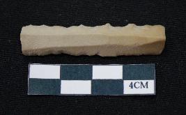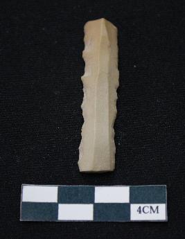 | Description / विवरण | Fragment of blade is dull brown in color, having long body, both ends broken, retouched parallel sides, ridges on the top and triangular section. |