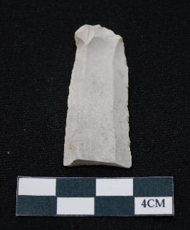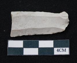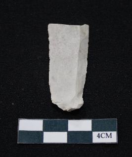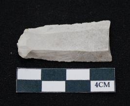 | Description / विवरण | Fragment of blade is white in color, having smooth body, positive bulb of percussion at one end, other end is broken, sides are retouched, ridges on the top and thin section. |