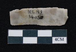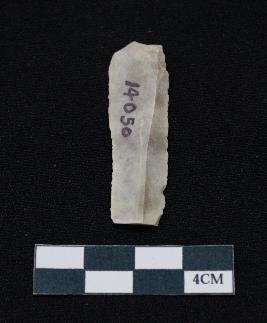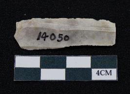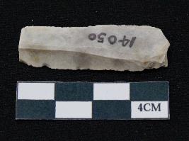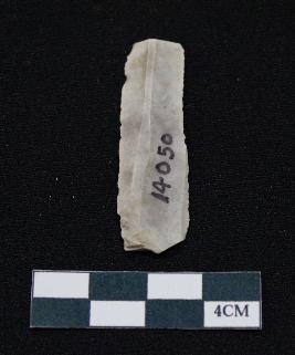 | Description / विवरण | Fragment of blade is white in color, having smooth long body, both ends broken, no retouching on both sides, mid ridge on the top and triangular section. |