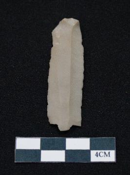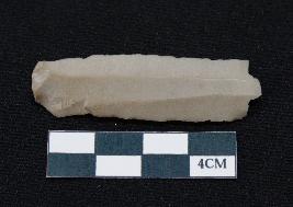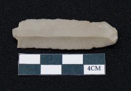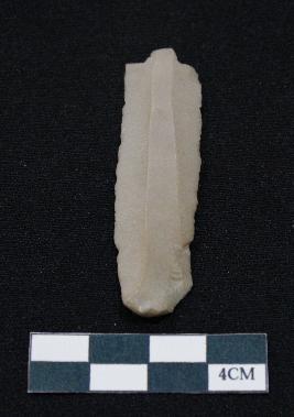 | Description / विवरण | Fragment of blade is off white in color, having smooth long body, positive bulb of percussion at one, other end is broken, retouched parallel sides, ridges on the top and triangular section. |
