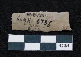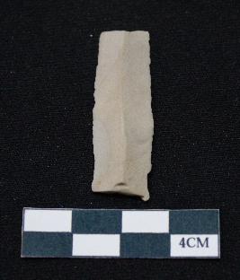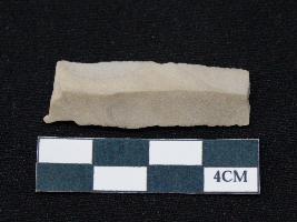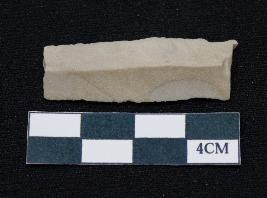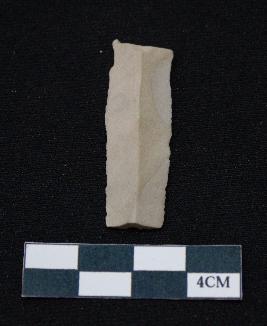 | Description / विवरण | Fragment of blade is off white in color, having smooth body, both ends broken, traces of retouching on both sides, mid ridge on the top and triangular section. |