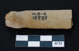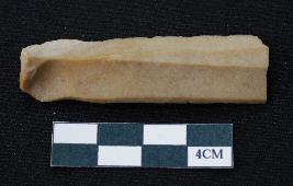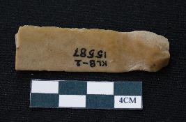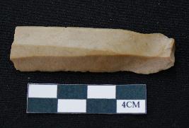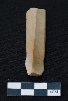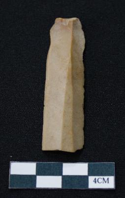 | Description / विवरण | Fragment of blade is brown in color, having positive bulb of percussion at one end, other ends is broken, one side is retouched, other has no retouching, ridges on the top and triangular section. |